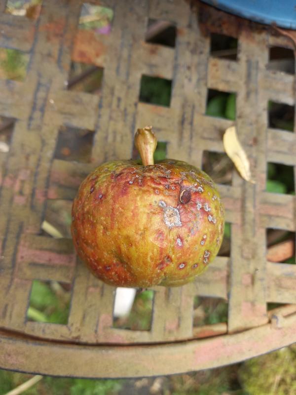 @Elro: Ich habe den Apfel heute gepflückt, weil er anfing zu schrumpeln. Ich denke nicht dass er reif ist. Schorfpilze machen sich aber zu stark an ihm zu schaffen.