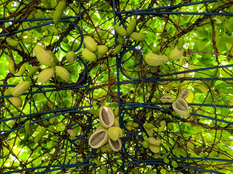 Heute morgen platzen hier die ersten vier Akebia-Früchte auf :D