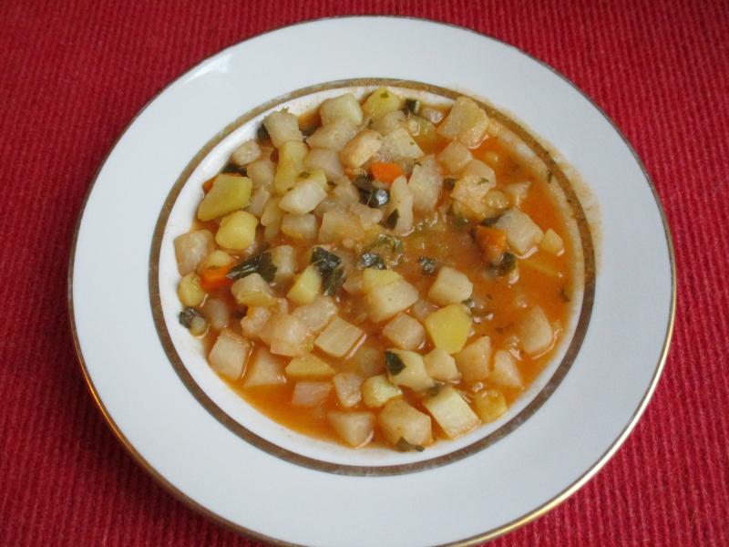 Die letzten Tage konnte ich einen dicken Kohlrabi ernten. Den verarbeitete ich heute zu Eintopf. Allerdings ohne "die krosse Kruste" :-\. Sonstige Zutaten: ewiger Kohl, Möhre, Porree, Kartoffel, Gemüsebrühe, Butter, Tomatenmark, Selleriegrün.