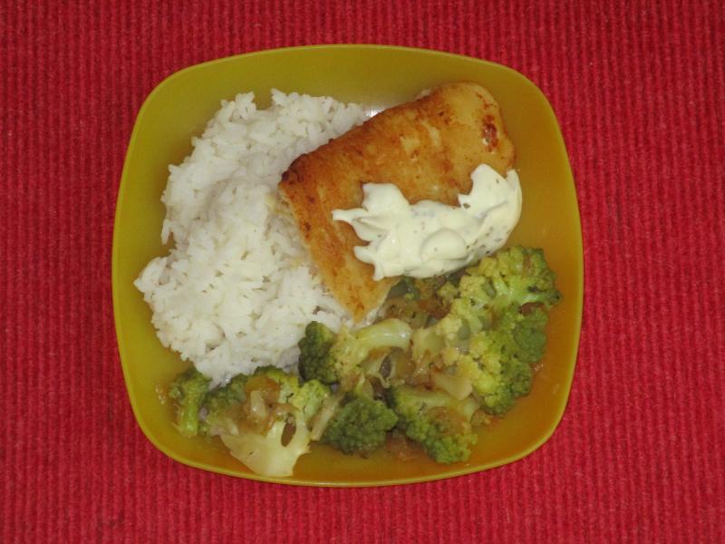 Es gab Backfisch im Bierteig mit Jasminreis, Romanesco-Zwiebel-Gemüse und Remoulade.