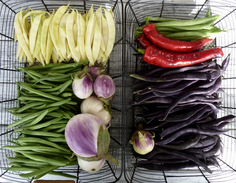 Ein paar Stangenbohnen, Chilies, eine Zucchini und zwei Auberginen.
