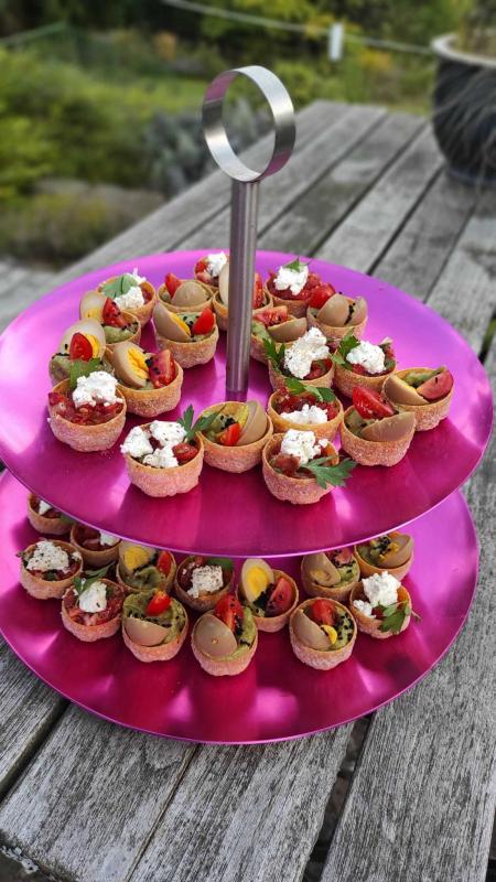 Vor ab zum Gintonic gab es Mini Croustades gefüllt mit Guacamole + eingelegten Wachteleiern und mit Tomatensalsa und Schafskäse.