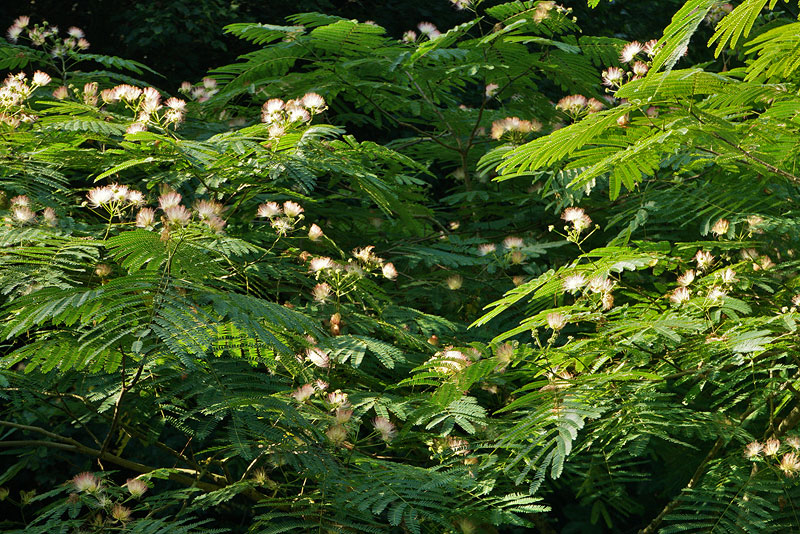Die große Albizia zieht dieses Jahr alle Blicke auf sich und hört nicht auf zu blühen.