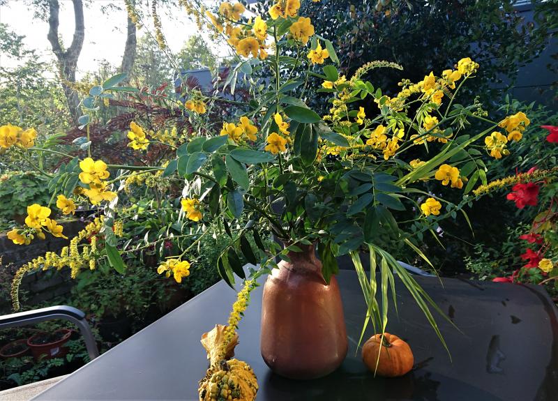 Beim herbstlichen Verrücken groß gewordener Kübelpflanzen brechen auch schon mal Zweige, hier aus dem Cassia-(Senna-)Busch. Mit Solidago "Fireworks" doch noch ein wenig tröstlich.