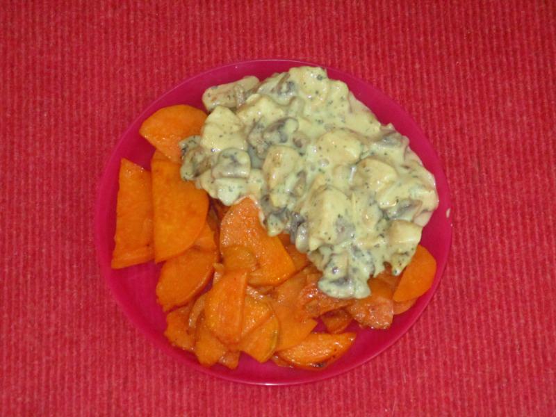 Hier gab es Süßkartoffeln mit Hähnchengeschnetzeltem (Huhn, Champis, Sahne, gerebelte Brennnesseln, Seswaa-Masala-Gewürzmischung, Salz, Öl).
