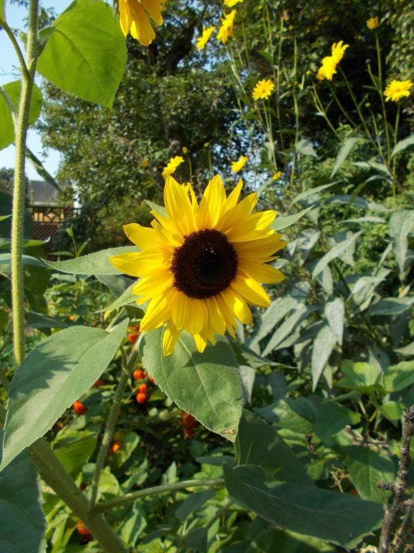 Helianthus-Ensemble: annuus mit x laetiflorus (und damit noch bissel andere Farbe reinkommt, dahinter Physalis alkekengi ;))