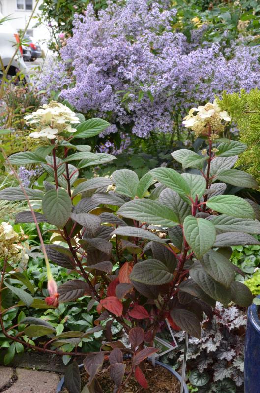 Hier hat die Eichblatthortensie ‚Pee Wee‘ schon ganz auf Rot umgefärbt. Aber wo die steht wollen mir Bilder nie gelingen.