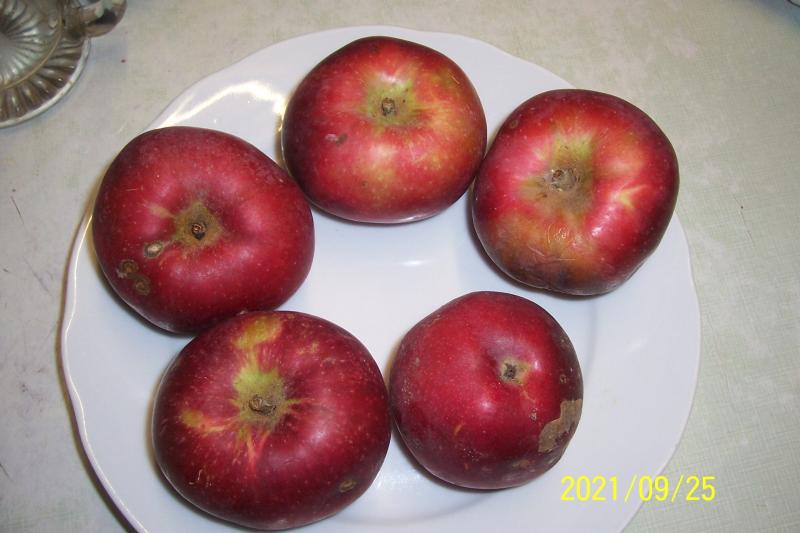 Vor ca. 8 Tagen habe ich meinen unbekannten dunkelroten Säulenapfel geerntet weil er fast allein abfiel. Es war ein halber Eimer voll, leider faulen sie sehr schnell. Sie sind genußreif, zartes Fruchtfleisch mit einem Hauch Beerenaroma.