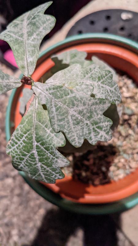 meine selbstgezogene Eiche ist seit längerer Zeit komplett weiß an den Blättern. Im Winter bei der Aufzucht war sie im Zimmer und seit es warm draußen ist, das ganze Jahr über im Garten. Zwei Meter vom Haus entfernt auf einem Tisch auf der Ostseite.