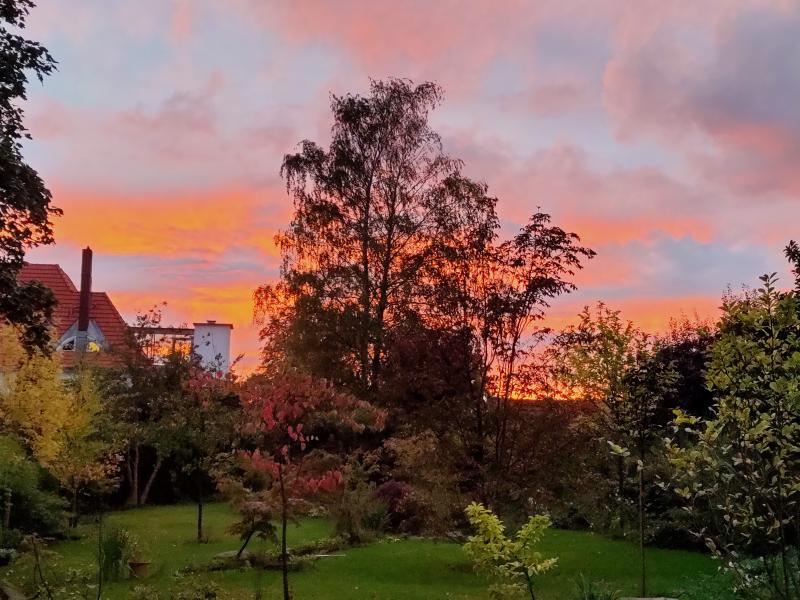 So einen ähnlichen Blick hatte ich heute beim Rudern auf dem Kanal - nur war Wasser und Wald statt Garten unter dem Farbspektakel.