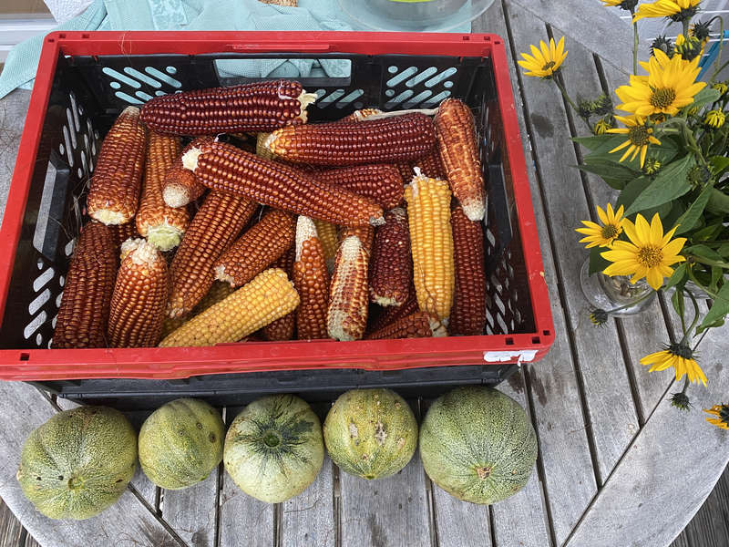 Hier gabs heute die letzten Freilandmelonen und eine Reihe vom Polentamais. Überraschend gute Ernte, es sind nochmal fünf Reihen. Bin gespannt, ob ich auch die Verarbeitung hinkriege. Die Melonen sind tatsächlich noch süss und aromatisch, bis gestern wars ja auch trockenwarm, jetzt wurde es trüber.