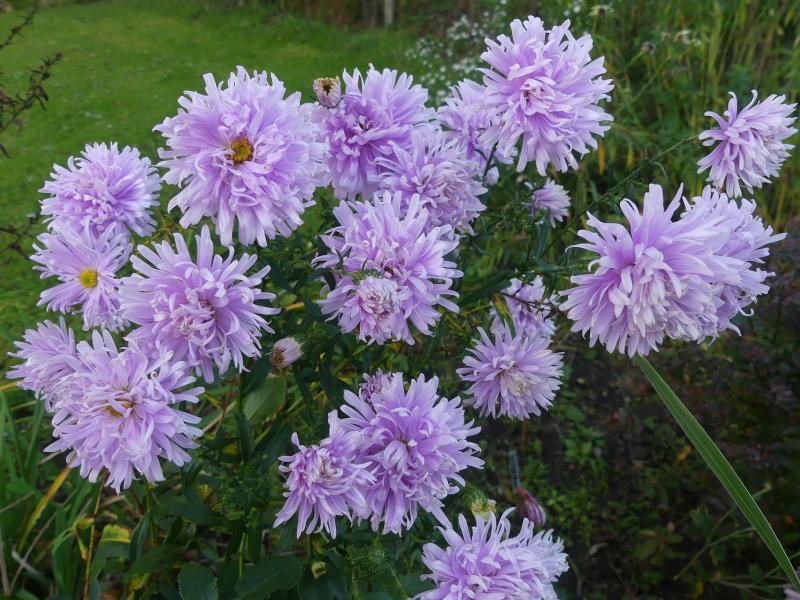 Symphyotrichum oblongifolium 'October Skies' blüht seit August, zeigt sich wenig standfest und war in diesem Jahr recht schüchtern im Wuchs. Da es in der Ecke, in der sie steht, auch anderen Pflanzen so geht, muss ich schauen, was da nicht stimmt.
