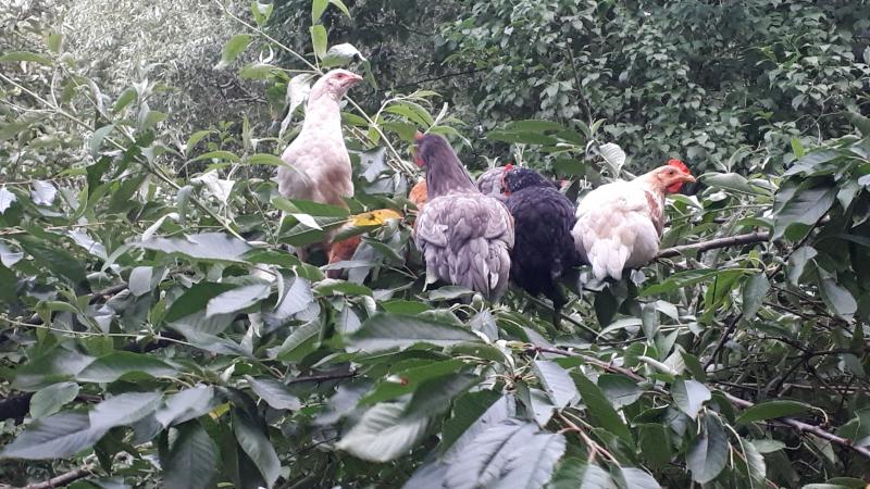Nun stehe ich schön da. Jeden Abend sind die Alten alle im Stall, und die 6 jungen HÜhner sitzen auf einem Baum. Die fühlen sich nicht wohl bei den anderen Hühner, sind immer etwas abseits und bleiben auch lange in der Voliere, bevor sie direkt in den Stall gehen (Fotos kommen).