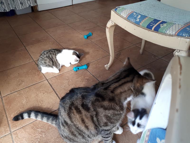 Die 2 Altkater an der Zimmertürschwelle habe nur dumm geschaut, der kleine Zwerg gleich zu den beiden hin und hat sie freudig begrüßt.