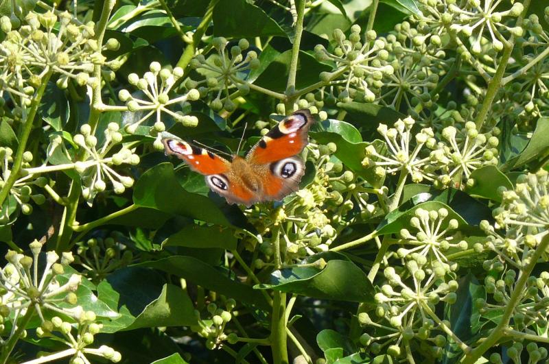 Auf den ersten Blick sieht das für mich nach der Altersform von Hedera helix aus, also stinknormaler Efeu. Der blüht jetzt und ist für Bienen und Schmetterlinge eine der letzten Futterquellen.