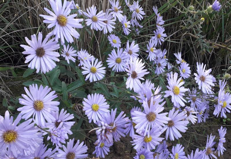Dahinter "October Skies", für die trockene Region hier sehr passend. Wächst sehr gut bei Trockenheit und blüht lange.
