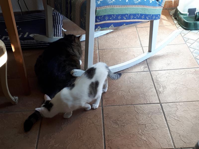 Die 2 Altkater an der Zimmertürschwelle habe nur dumm geschaut, der kleine Zwerg gleich zu den beiden hin und hat sie freudig begrüßt.