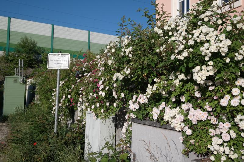 Vier mal weiß und einmal rosa Rosen plus Philadelphus am Zaun entlang. Die Blüten kommen zeitlich versetzt, was von Vor- und Nachteil ist: