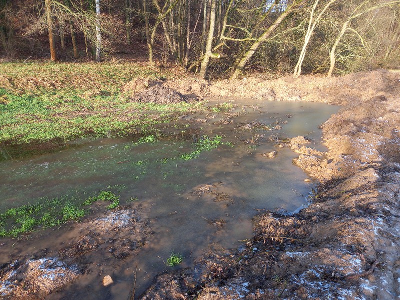 So Teichprojekt 2 ist auch weiter in Entstehung. Der Deich im hinteren Bereich hat schon die Endhöhe, vorn fehlt noch ein halber Meter. Der Teichboden wird noch ausgebaggert, das Tiefen bis maximal 1,50m entstehen. Die Fläche entspricht ungefähr Teich 1 mal 3! Aktuell steht Regenwasser drin, sprich es läuft noch nichts rein. Geplant ist daß das Wasser aus Teich 1 in 2 läuft und dann weiter in den Graben. Dieser Teich ist dann ohne Netz geplant und eher für Schleien, paar Karpfen und Natur gedacht. Evtl kommen auch paar Edelkrebse rein.
