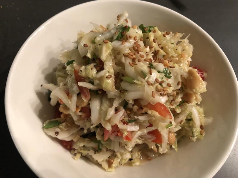 Leider war das dort beschriebene Rezept vom Chinakohlsalat für unseren Geschmack enttäuschend. Es schmeckte uns erst nach Zugabe von Limettensaft, Fischsauce, frischem Koriander und Chili.