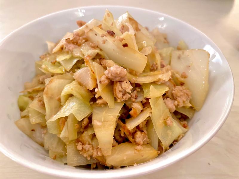 bei uns resteessen nach der heutigen sauerkrautherstellung: selbst importierter allerfrischester weißkohl aus dithmarschen ergänzt mit hackfleisch vom bio-schwein, beides in in selbst gewonnenem gänseschmalz gebraten und mit nur einem hauch meersalz und kümmel gewürzt
