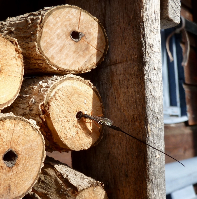 Conni, ich kenne mich bei den Wildbienen/-Wespen überhaupt nicht aus. Sage auch nichts zur Art. Ich beobachte sie nur bei mir beim Einbohren des sehr langen Legestachels. Aber auch nicht im Oktober, das muss ich dir recht geben. Es war immer deutlich früher im Jahr.