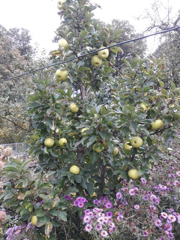Robust, kein Mehltau, Schorf, schwachwüchsig wenig Seitenäste die ich drangelassen habe. Kommt zwar früh in Ertrag aber nur schwächer Behang. Die allermeisten Blüten fallen unbefruchtet ab. Das ist erst die letzten 3 Jahre anders geworden. Leuchte Ausdünnung erstmals dieses Jahr. Hatte 2019/20 stark Sonnenbrand an den großen flachrunden Früchten. Es gibt aber auch etliche kleinere also große Streuung. Diehellgelben leicht grünlichen Äpfel sind sehr saftig, säuerlich würzig und halten bis max. Mitte Januar. Dabei werden sie ziemlich weich ab Dezember. Die Ernte ist Anfang bis 20.10. Dieses Jahr die erste Pflücke 1010. den Rest wohl am 17.