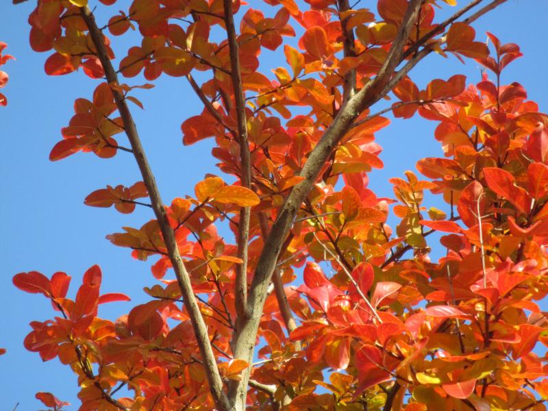Cotinus kenne ich als dicht belaubt, die Belaubung dieses Baumes ist sparssam, man kann sehr deutlich die Äste sehen. Die Färbung des Laubes ist mir bisher nie aufgefallen, das müsste Herbstfärbung sein.