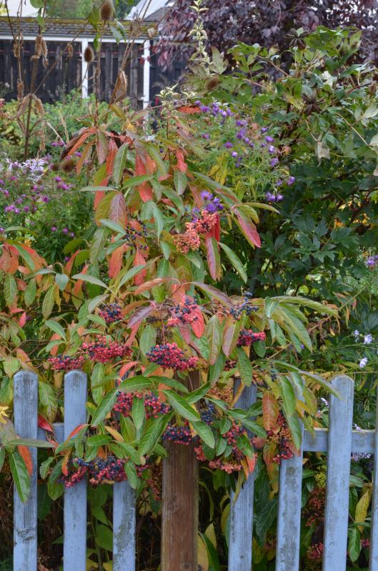 Außenansicht mit Viburnum nudum 'Pin Beauty'.