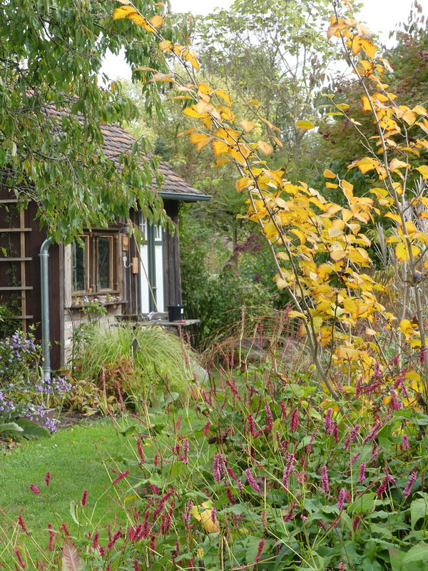 Weiter hinten beim Gartenhaus. Hamamelis 'Birgit' färbt bereits.