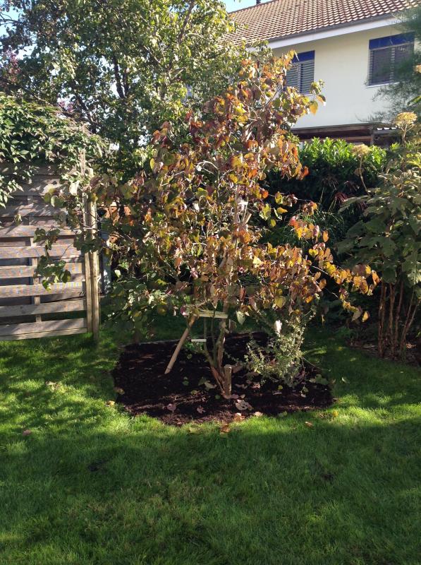 Ja und er stand vorher schon ein bisschen schräge. War dem Wurzelballen angepasst bzw. wenig korrigiert. Nun geht es in den zweiten Winter da habe ich gleich gut nachkorrigiert.