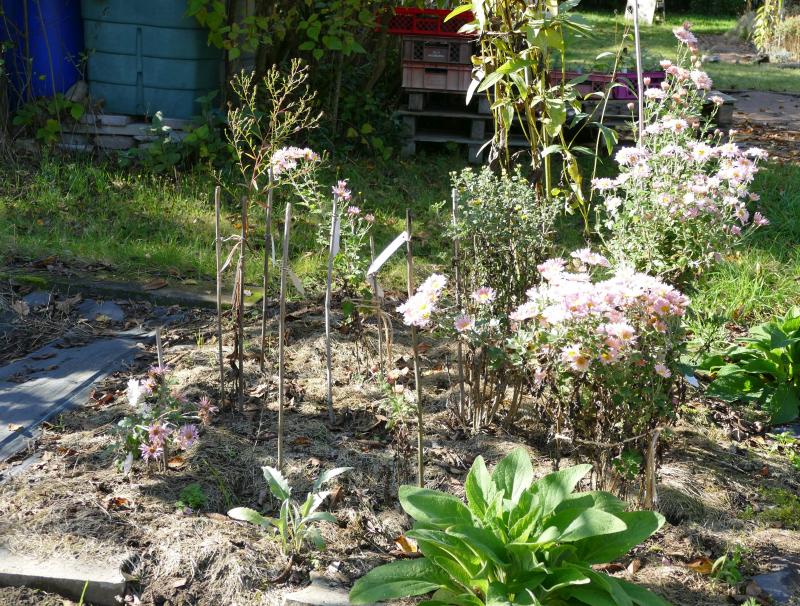 Für Ankes legendäre Chrysanthemen-Sämlinge gibt es bei mir ein kleines Sichtungsbeet. Es waren zunächst 11 Pflanzen als wir sie genau vor einem Jahr gemeinsam setzten. Später bemerkte ich dass an einer Stelle zwei verschiedene kamen also waren es dann 12. immer vier pro Reihe, Nummerierung beginnt im Bild unten rechts mit AS_01. In meinem trockenen mageren Sand habe ich ganz viel Lehm/Lös mit meinem Kompost gemischt und eingearbeitet sowie an die Pflanzen gegeben. Gegossen wird bei mir nach dem Pflanzen, dann nicht mehr, ich mulche aber.