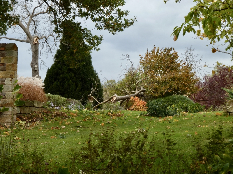 Es wird eine Weile Sägerei geben, dafür hat sich eine andere Arbeit schon erledigt: Auf den beiden anderen Walnußbäumen hing noch fast alles Laub, marsonninakrank. Da hätte ich noch eine Weile Laub rechen, in Säcke stopfen und zur Humuswirtschaft bringen müssen. Hätte - die Bäume sind nach dem Sturm fast kahl, das Laub ist irgendwo, jedenfalls nicht mehr hier. Die Spitzenböen hatten in Dresden laut Wetter auf der Leine 112 km/h.