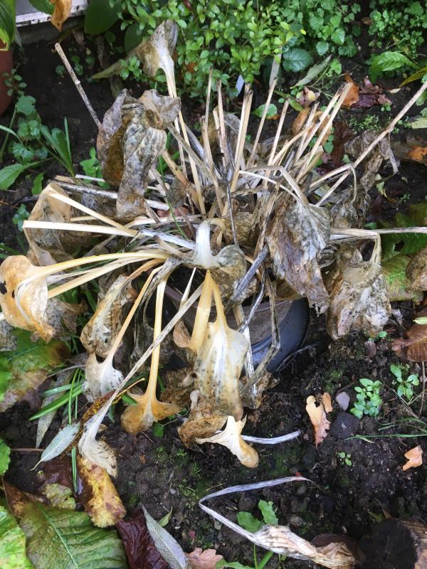 matschepflanzen, laub in umengen, veralgter boden von sturm und regen der letzten wochen - so sieht es im Schleigarten bei den Hostas aus . . .