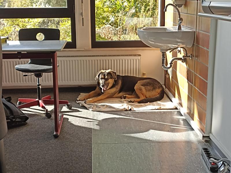 Auch wenn neue Situationen für diesen Angsthund zunächst mal erstmal immer ein wenig aufregend sind, sieht man ja, dass er mittlerweile völlig entspannt in der Klasse liegt. Er hat mich zwar oft im Blick und beobachtet mich, aber ist dabei völlig gelassen und schläft auch ein, wie man sieht.