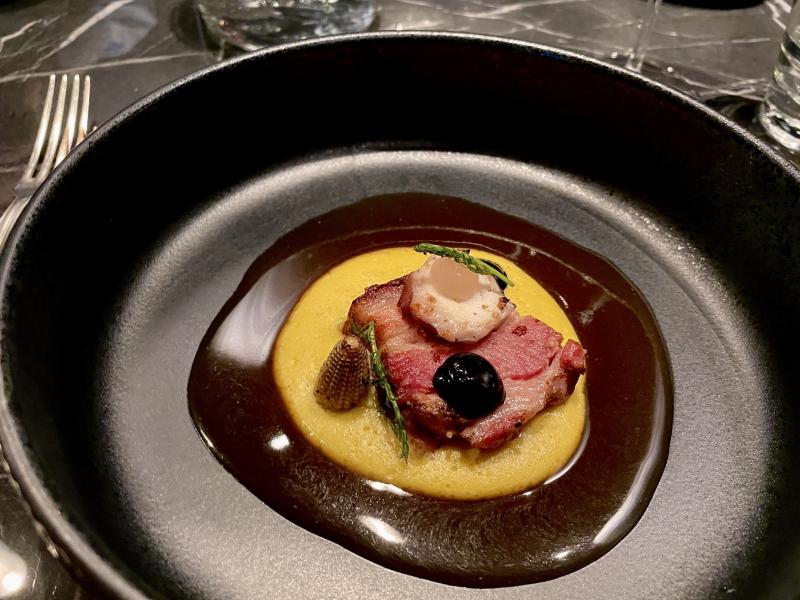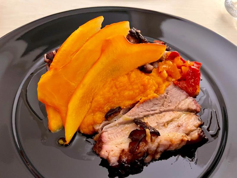 etwa drei stunden wechselseitig im ofen gebacken in einer marinade aus entfetteter fleischbrühe, mirin, sojasauce mit etwas ingwer und frischer chili – leider schafft mein gasbackofen keine kruste und ich hatte etwas zu tief eingeschnitten, deswegen löste sich die geröstete speckschicht zu sehr, mal ganz abgesehen vom panischen und anrichtefeindlichen versuch, das einigermaßen heiß auf den tisch zu bringen… ;)