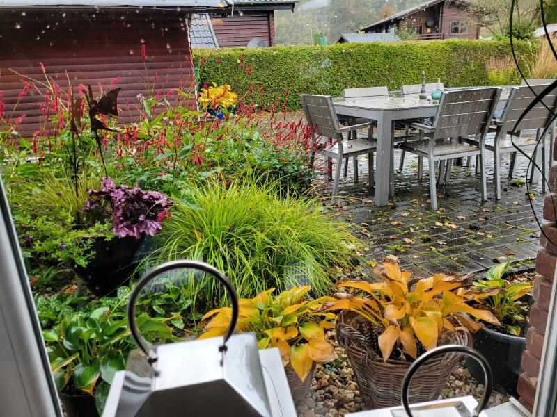 Wir werden gleich die frostgefährdete Deko und einige Möbel und Töpfe einräumen. Ich werde die Hosta im Topf teilweise schon schneiden und wegstellen. Dieses Jahr werde ich auch mehr Stauden herunter schneiden müssen als sonst im Herbst. Der Regen hat einigen so heftig zugesetzt, daß der berühmte Winteraspekt für sie buchstäblich flach fällt. :P