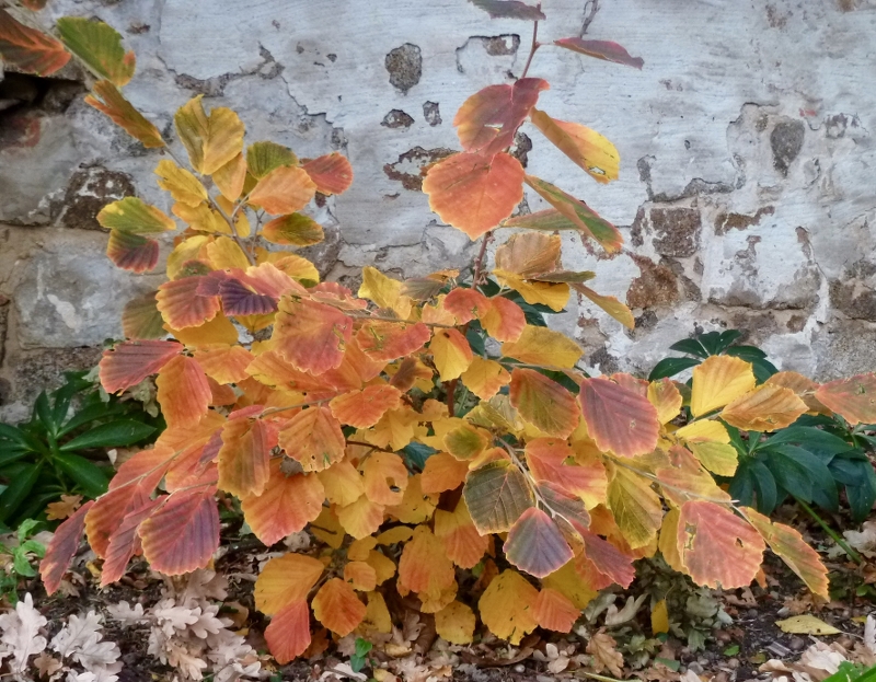 Ich finde es immer wieder erstaunlich, wie unterschiedlich Hamamelis derselben Sorte an verschiedenen Standorten färben. Kaunis zeigt im Thread "Es wird Herbst" eine 'Jelena', die strahlend orange färbt. 'Jelena' steht bei mir ziemlich schattig und färbt reingelb. Und die Färbung von Jules 'Washington Park' sieht auch völlig anders aus als die von meinem Exemplar. 'Washington Park' steht bei mir an einem Platz, der vom Frühjahr bis zum Herbst Sonne von morgens bis mittags bekommt, tiefstehende Sonne im Winter schafft es dort nicht hin. Sie färbt (jedenfalls in diesem, ihrem ersten Jahr in meinem Garten) bunter als alle anderen Hamamelis, die ich bisher gepflanzt habe.
