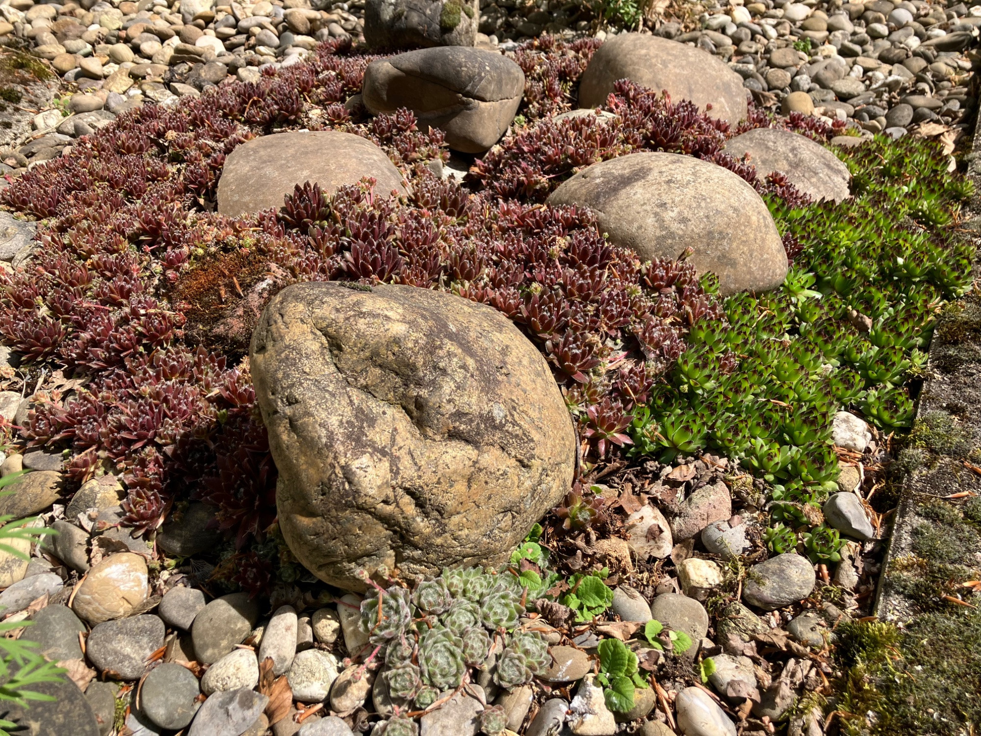 Hauswurz ist einfach eine Pflanze zum Niederknien: Bescheiden und zäh gehen sie ihren Weg ( die todesmutigen Primeln standen ihnen im Weg, gejätet.)