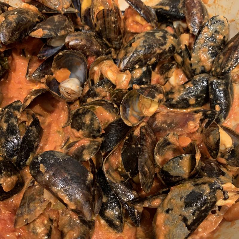 Bei uns gab es Muscheln mit Tomatensoße und Schafskäse