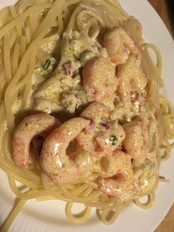 Spaghetti mit Scampi in Zitronensauce. Außerdem Knoblauch, Chili, Petersilie, Creme fraiche, S&P, Olivenöl.