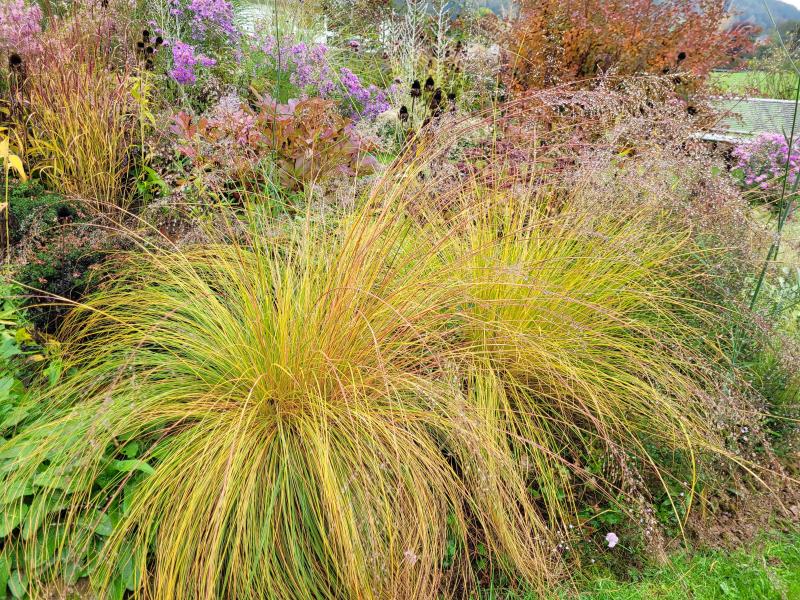 'Cloud' ist mit seinen roten Stielen sicher schön zu 'Tanna'. Zurzeit ist der Horst leuchtend Gelb, aber im Sommer eher graugrün.