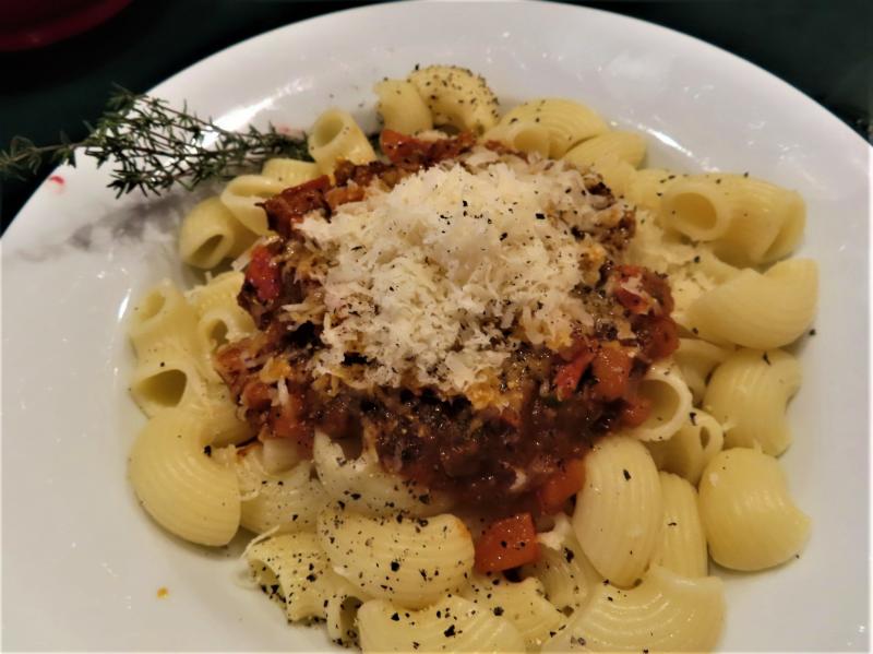 So gab es am Mittwoch einen Sugo aus geschmorter Zwiebel, kleinen Kürbisstückchen, Tomatenmark, einem kleinen Rest Rehragout vom Dienstag, Rosmarin und Thymian und am Schluß einem Schuß Olivenöl. Geplant wird das nie so gut ;D