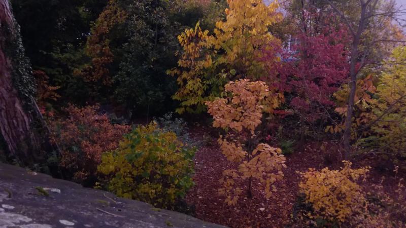 Hier schien heute Nachmittag die Sonne ganz wunderbar, und so leuchteten die beiden Haseln in Goldgelb, die Felsenbirne ist schon etwas ausgedünnt, aber der kleine Acer palmatum 'Orange Dream' daneben ist noch voll belaubt und glüht jetzt richtig auf. :D