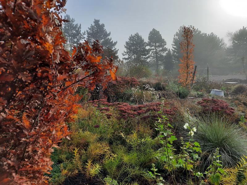 Das Winterbeet Die Hartriegel strahlen wunderbar mit ihrer gelben Herbstfärbung. Die dunklen Berberitzen sind die gesamte Saison ein super Kontrast dazu.
