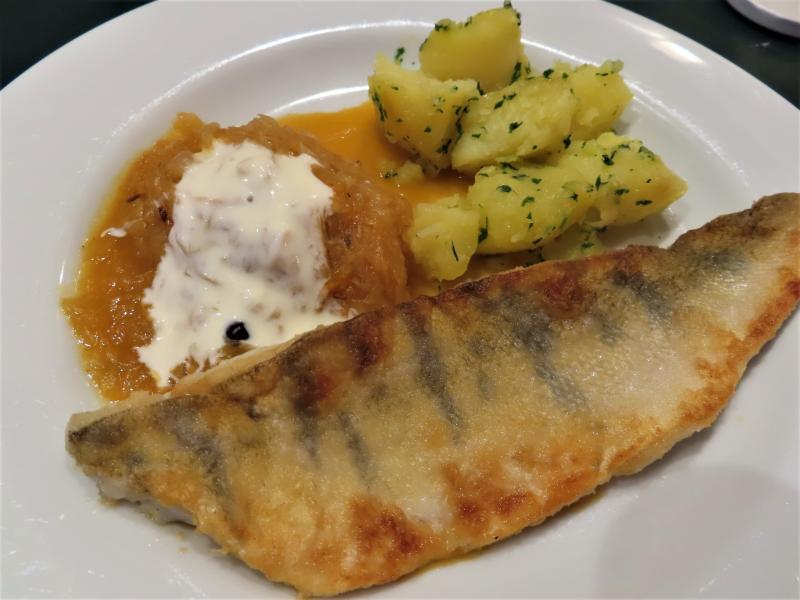 Sauerkraut von gestern wurde mit einer Sauce aus gerösteten Zwiebeln, Paprika und fein geriebenem Erdäpfl versehen, dazu Zanderfilet und Petersilerdäpfl. Sehr gut :)