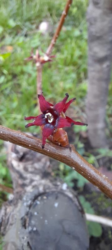 Disanthus cercidifolius steht in voller Blüte. Allerdings sieht man die kleinen Dinger nur, wenn man direkt die Äste vor der Nase hat.