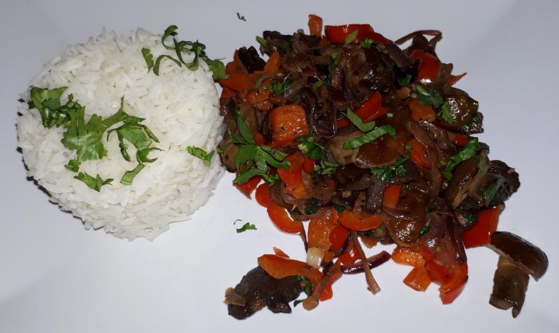 Waldpilze mit Zwiebeln, Paprika und frischem Koriander, Basmati und verschiedene Blattsalate