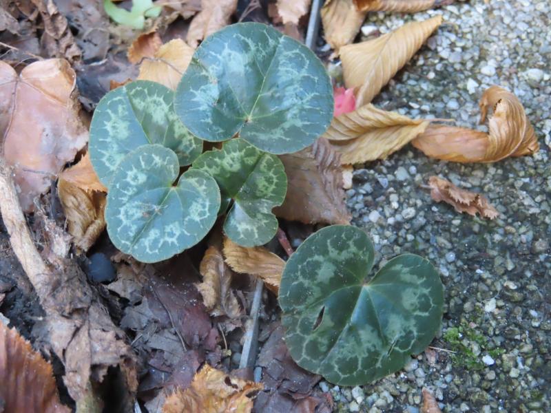 Ich müßte auch mal eine Fotorunde machen, es gibt da und dort schönes Laub. Aber - die Cyclamen sind seltsame Wesen: Gestern entdecke ich in der letzten Ecke des Hofgartens, in dem Beet zwischen Liftkabine und Haustüre, das so schlecht und trocken ist, daß ich jahrelang gebraucht habe, um es wenigstens mit Efeu zu bedecken, einen hübschen, gar nicht so keinen C. Purpurascens-Sämling. Nicht vielelicht im Beet, sondern ganz außen an der Wegkante, wo es überhaupt am schlechtesten ist. Der ist gut 10 m von den Mutterpflanzen entfernt! Nie wär ichauf die Idee gekommen, dort Cyclamen hinzusetzen.