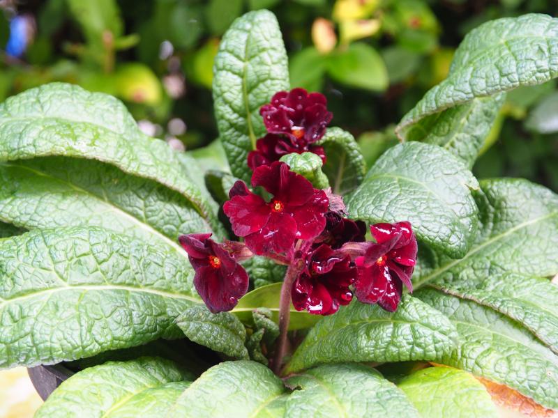 immer noch blüht Primula Garnet Cowichan. Meine Lieblingsprimelsorte. Sie hat einen prominenten Platz auf dem verregneten Gartentischchen.